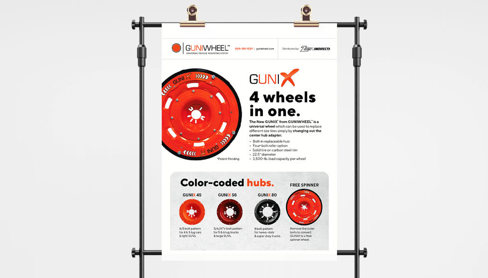 Gunniwheel is a universal vehicle-mountable wheel designed for mobility in auto repair, transport, and storage. The ads highlight the product’s versatility and durability with bold visuals and clear messaging, ensuring quick comprehension for automotive professionals. The design maintains a clean, high-impact layout that aligns with Gunniwheel’s brand identity, effectively communicating its benefits at a glance. I designed promotional emails, tradeshow posters, publication ads, and digital ads for Gunniwheel.